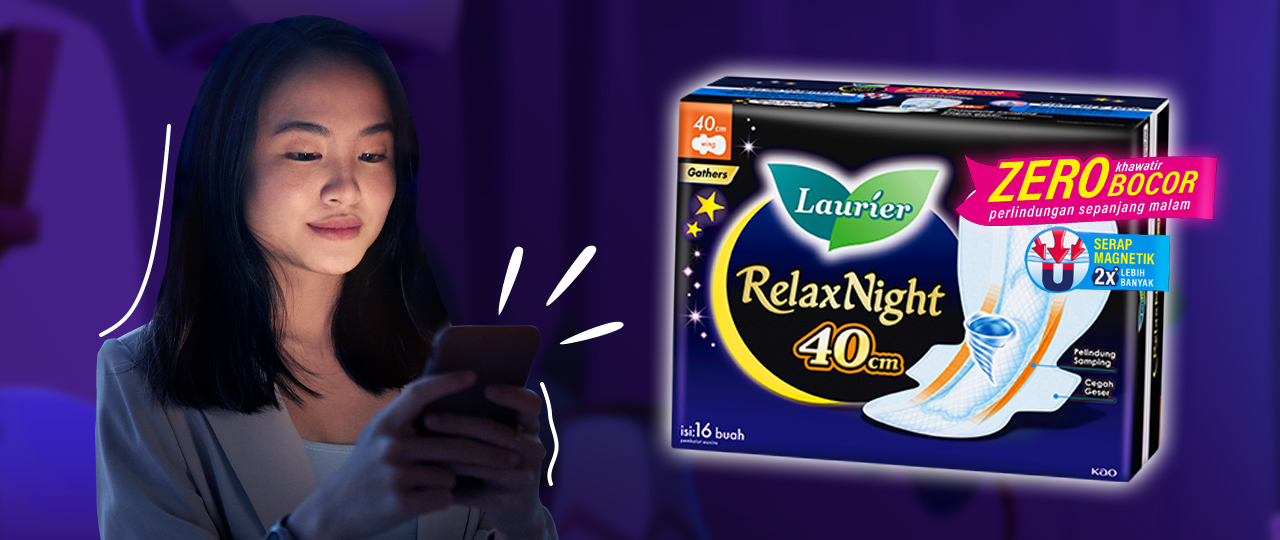 Laurier Relax Night juga memiliki Fyber Dry Tech, dengan permukaan lembut, berpori, cepat menyerap, dan kering maksimal. Varian gathers dilengkapi dengan extra pelindung samping 3D, melindungi dari bocor samping dan pas menempel tubuh. Laurier Relax Night, hari deras relax, bebas horor dan bikin kamu ZERO khawatir BOCOR sepanjang malam.