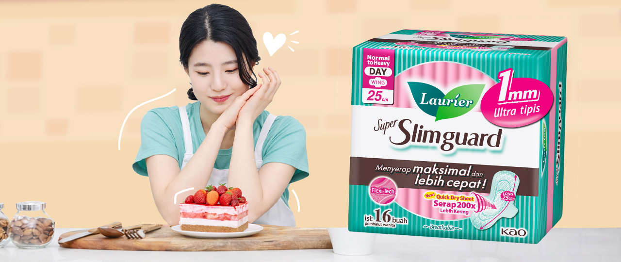 Saat menstruasi, kamu bisa menggunakan Laurier Super Slimguard. Pembalut ultra slim dengan Teknologi Lapisan Serap Ultra Tipis 1mm dan Quick Dry Sheet yang serap 200x lebih kering, dengan permukaan lebih lembut. Laurier Super Slimguard juga dilengkapi dengan Flexi-Tech yang nyaman dan fleksibel mengikuti bentuk tubuh. Laurier Super Slimguard, Tak Terasa Pakai Pembalut!